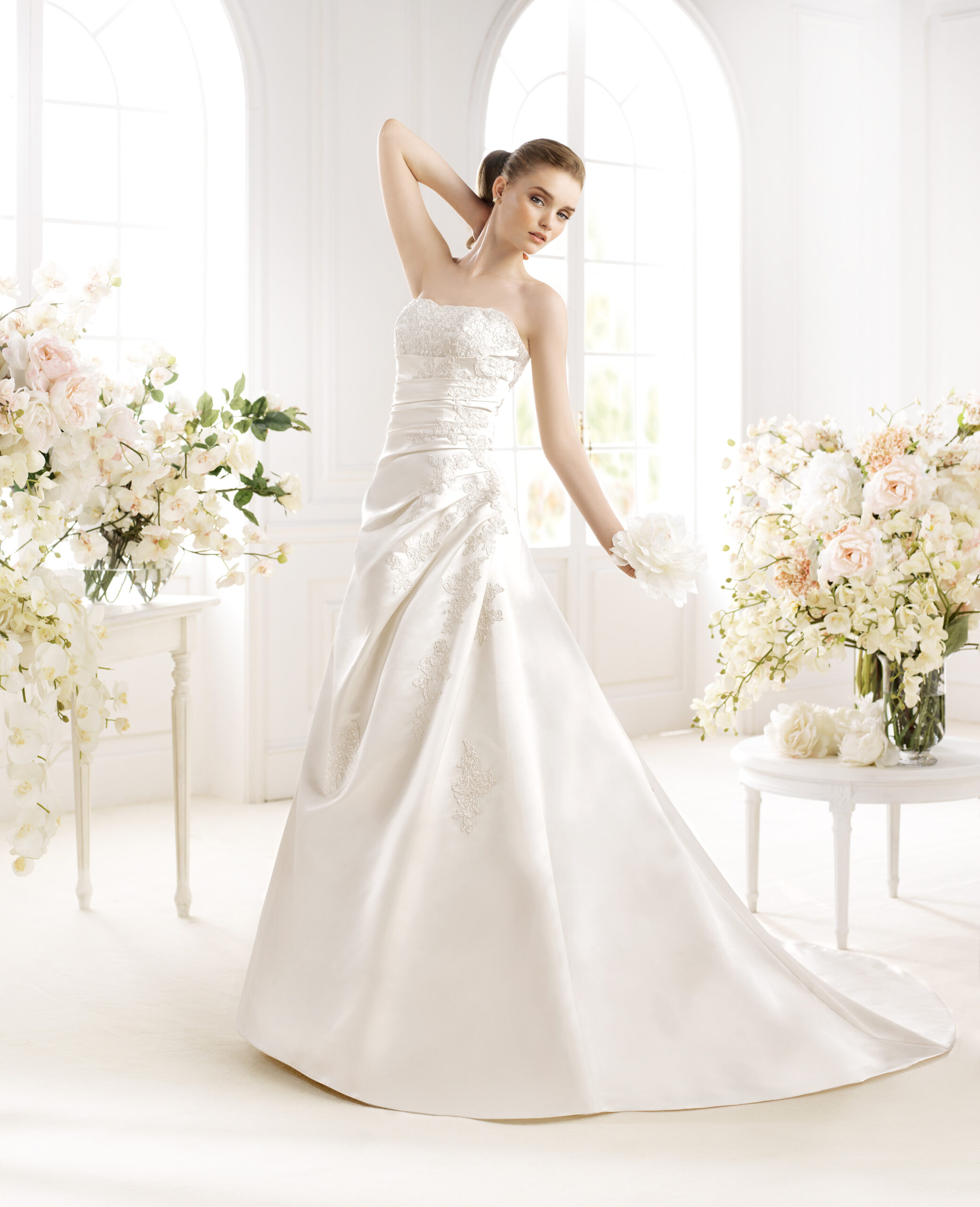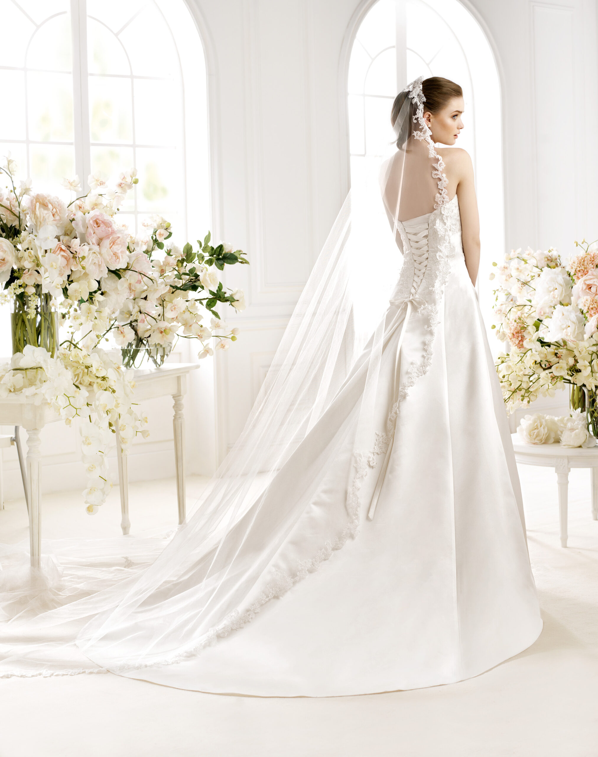 Vestido de novia con hermosos apliques bordados esmerilados que caen en cascada desde las mangas casquillo transparentes y el corpiño que conduce a una falda fluida de gasa de línea A. Una hermosa espalda en forma de ojo de cerradura y un tren suave con detalle de encaje recortado completan este look sin esfuerzo.