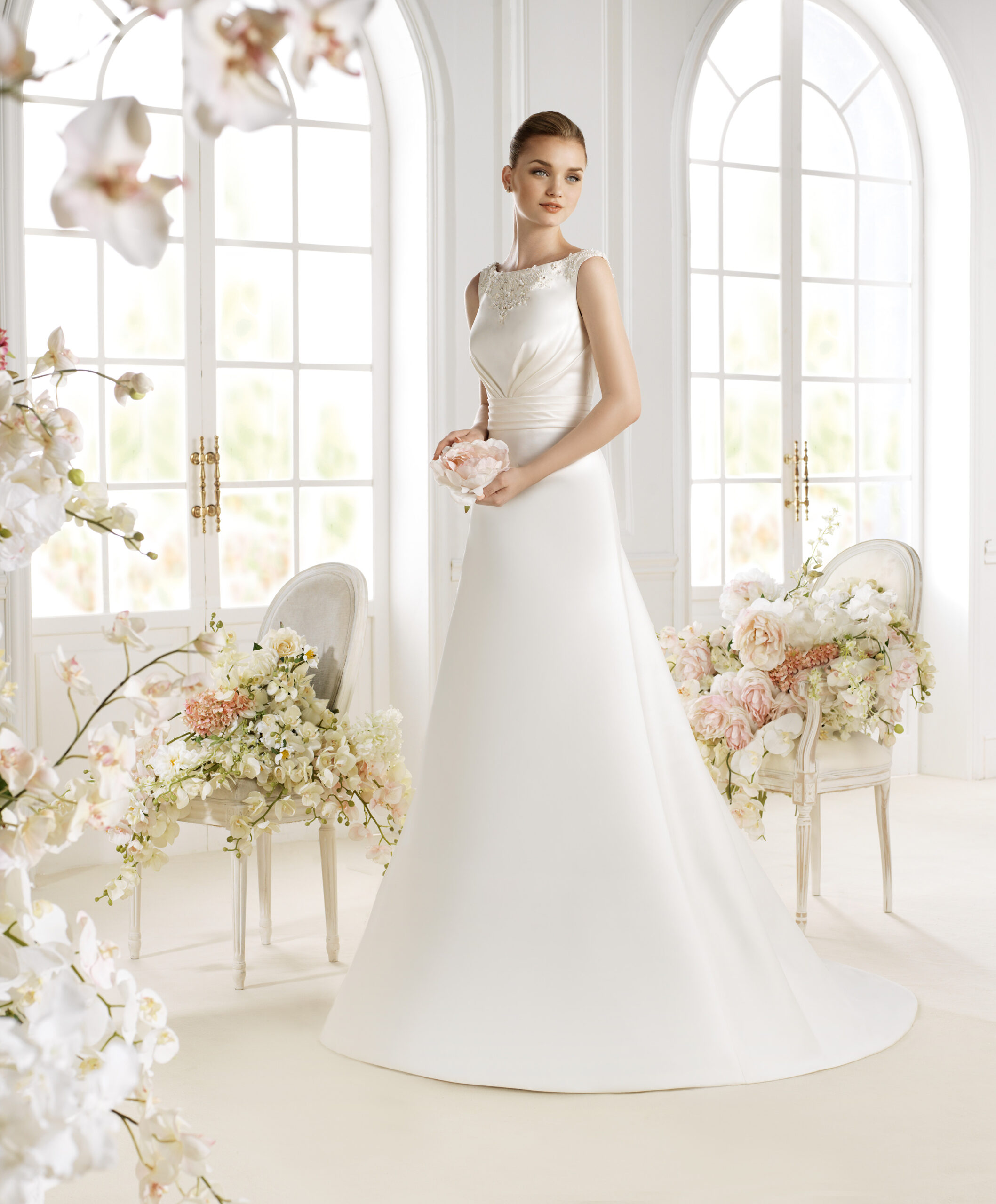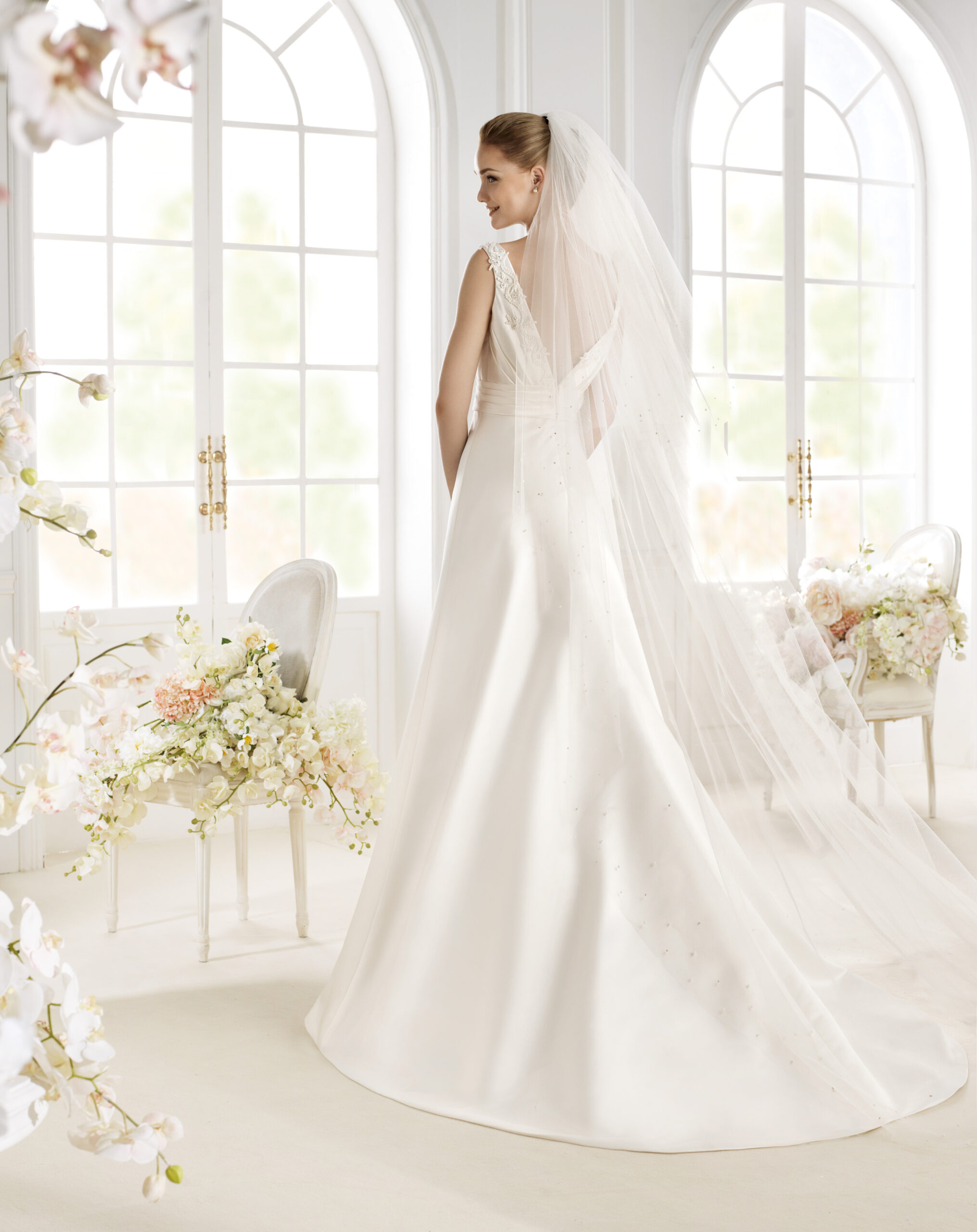 El vestido de novia presenta aplicaciones de encaje veneciano escarchado sobre satén elástico con cola festoneada recortada