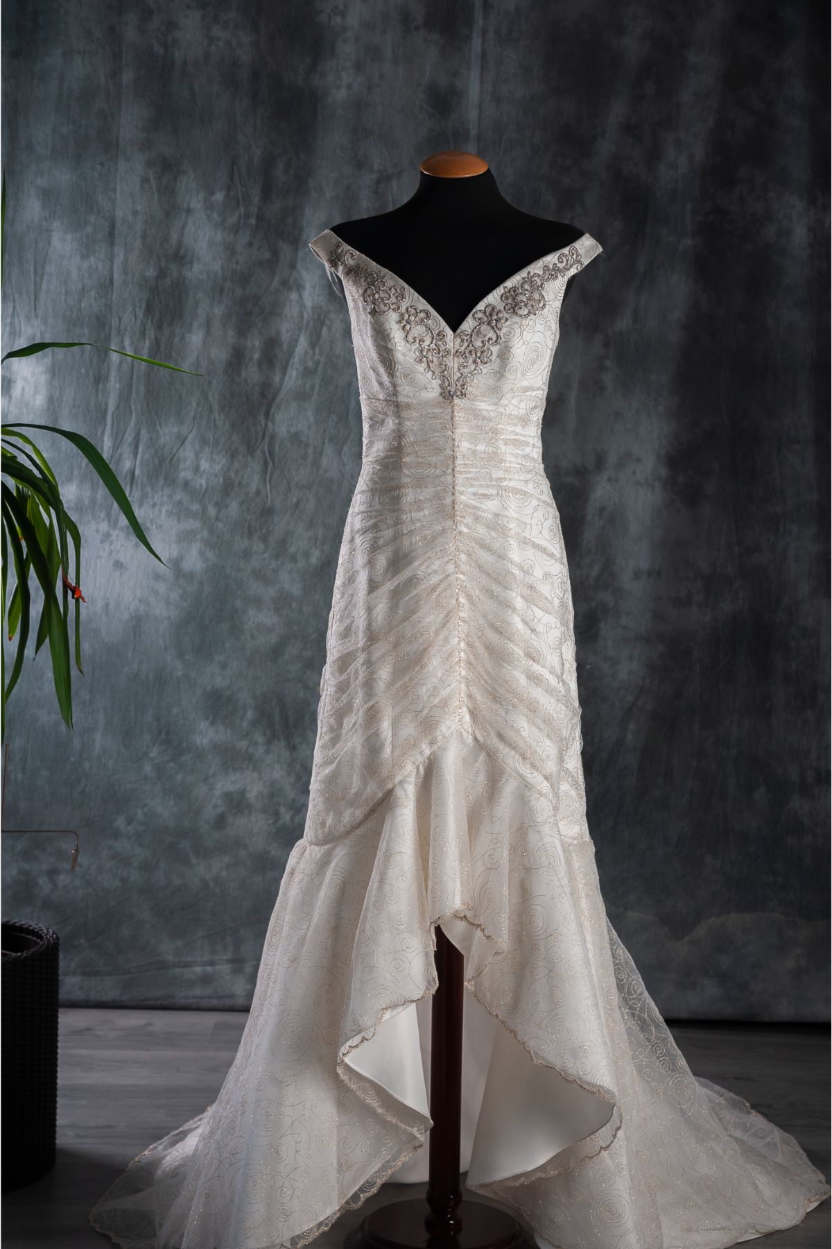 Vestido de novia con un encanto sencillo y un estilo natural con sus impresionantes aplicaciones de encaje esmerilado en un corpiño con escote en V y hombros descubiertos. La enagua fina de encaje Chantilly con lentejuelas abraza la figura y añade la cantidad perfecta de brillo nupcial, mientras que la sobrefalda de red vaporosa con cola transparente crea un acabado suave y delicado
